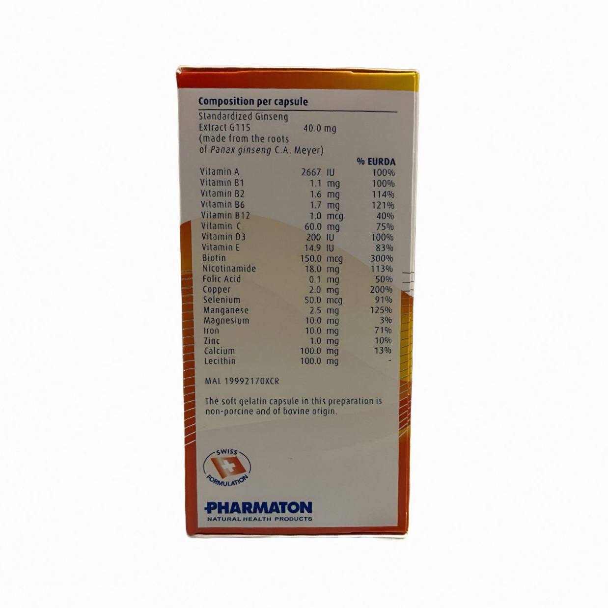 • جعبه کپسول فارماتن سانوفی PHARMATON دارای هولوگرام with Ginsengاست. و لیبل غذاودارو ندارد.